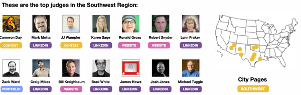 For our Top 10 judges in each region, we are placing their names, pictures and *NEW* a link to their Linkedin page, their portfolio, or their website right on the Leader Board.