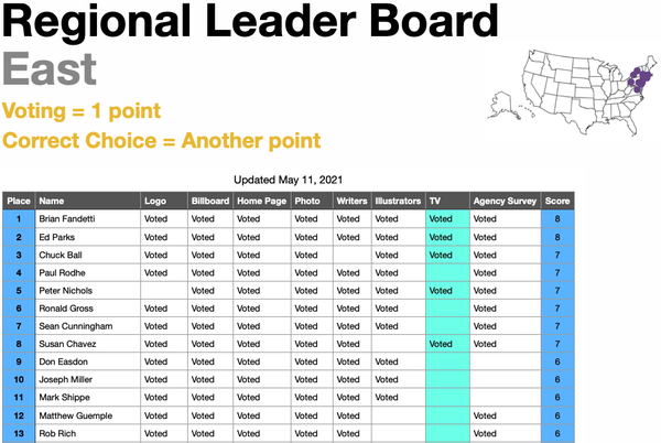 Scan to see which categories you are missing, and then move up the list by voting. I have highlighted our :30 Television category, which just opened. You could get a good boost by judging there – and there is some great work.